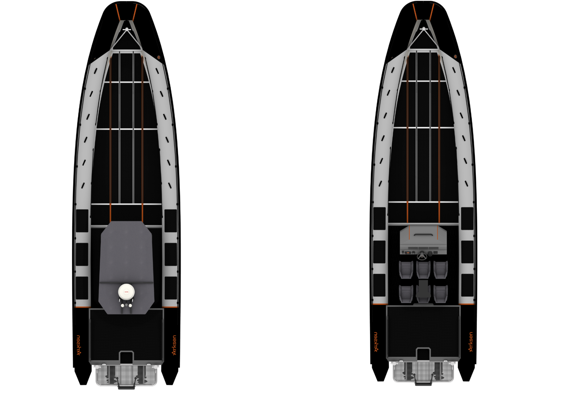 The navigation suite is based on a full Garmin architecture, including twin 16” MFDs and Fantom radar, with integration flexibility for owner-specified modifications. The forward deck is configured for operational versatility, incorporating Aero-track tie-down points to secure the carriage of e-bikes, dive systems, and mission equipment. A removable, custom-fabricated bike rack can be designed and fitted to integrate with the track system, allowing secure transport while maintaining deck flexibility when not in use. Deck finish options include Esthec, SeaDek, or grip-applied non-skid, depending on duty profile. A pressurised freshwater system (80–120L) with a transom shower is integrated for dive and guest support.
