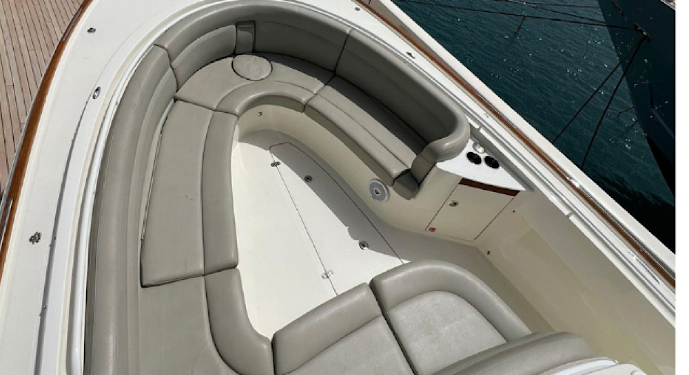 She comes with upgraded fwd and aft Biminis, the latter with black Carbon poles, to